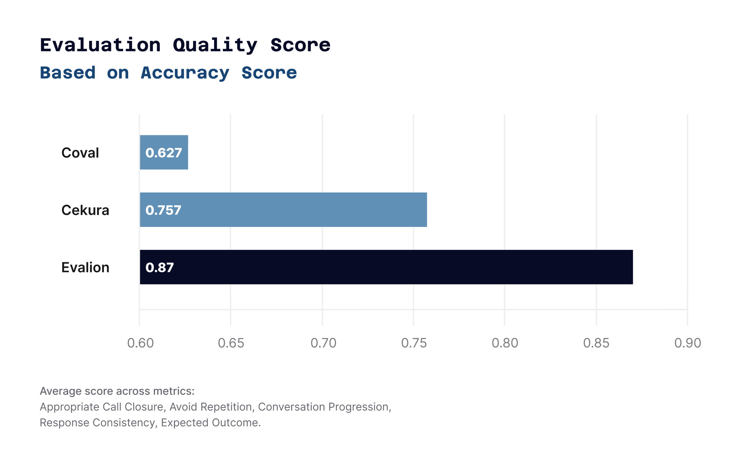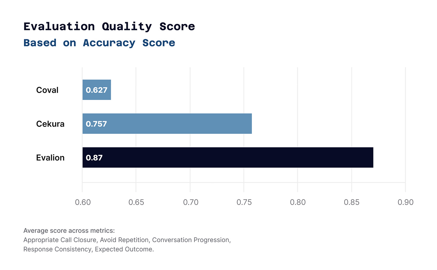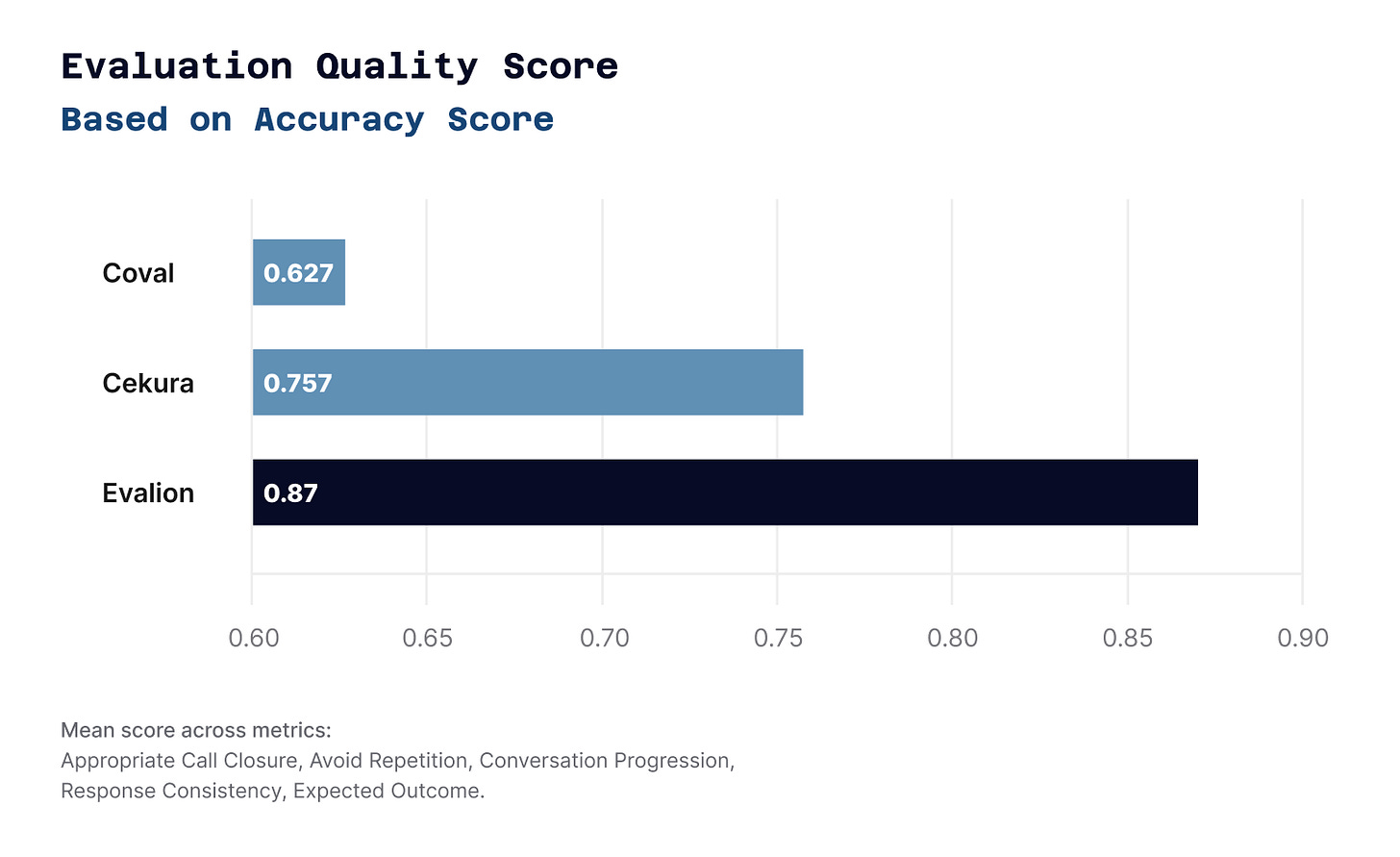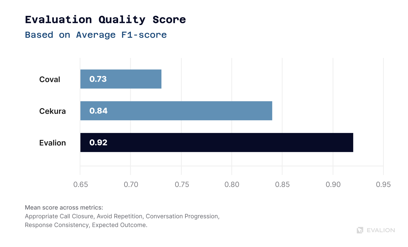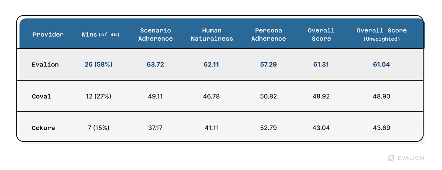 Scenario Adherence revealed the largest gap (26.5 points). Some platforms failed to follow basic test requirements, undermining the validity of their tests. Evalion scored 63.7—keeping simulations aligned with test objectives—while others frequently went off-script.