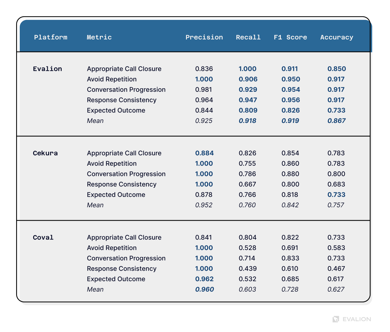 Furthermore, when looking at the Mean F1 score, results showed a critical gap, ranging from 0.73 (misses or misidentifies 27% of quality issues) to 0.92 (approaching human-level accuracy) in F1 scores. That 19-point difference determines whether you catch mission-critical issues, or miss nearly a third of them.